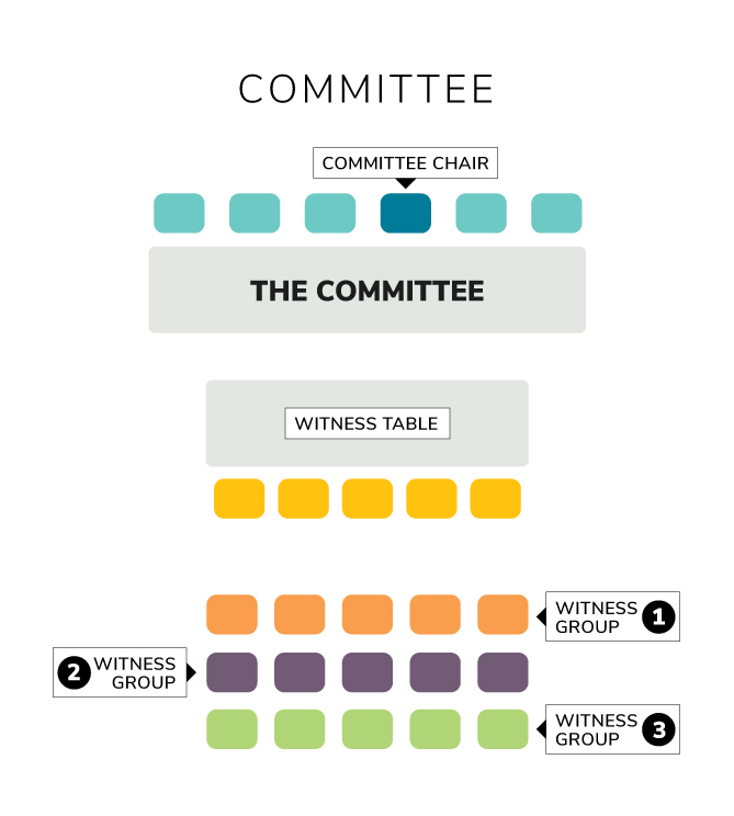 - The committee chair starts the hearing by introducing the committee, outlining the terms of reference and listing the witness groups.